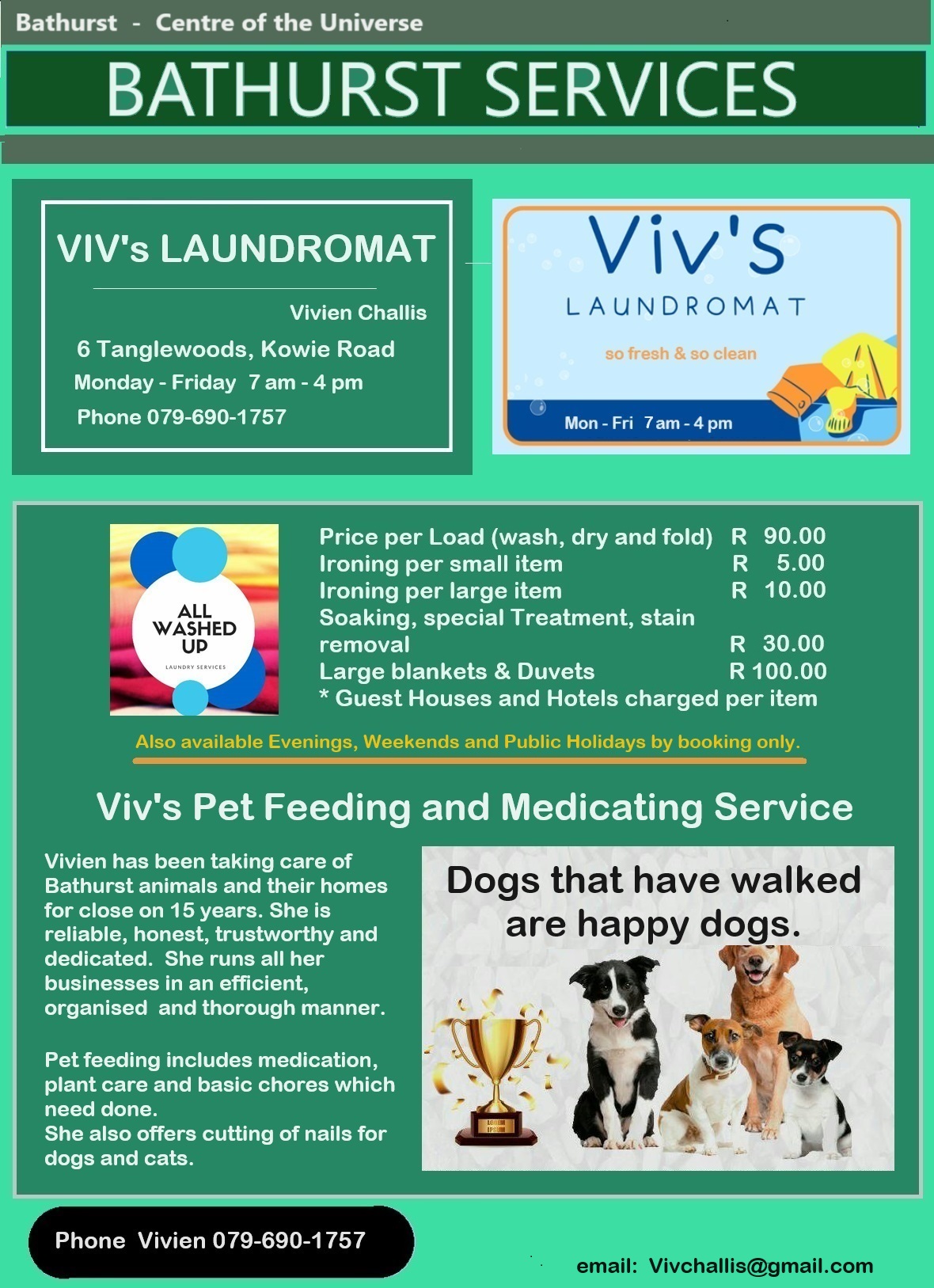 | Viv’s Laundromat | Laundry / Dog Walking | Vivien Challis | 079-690-1757 | Kowie Road / vivchallis@gmail.com | ||