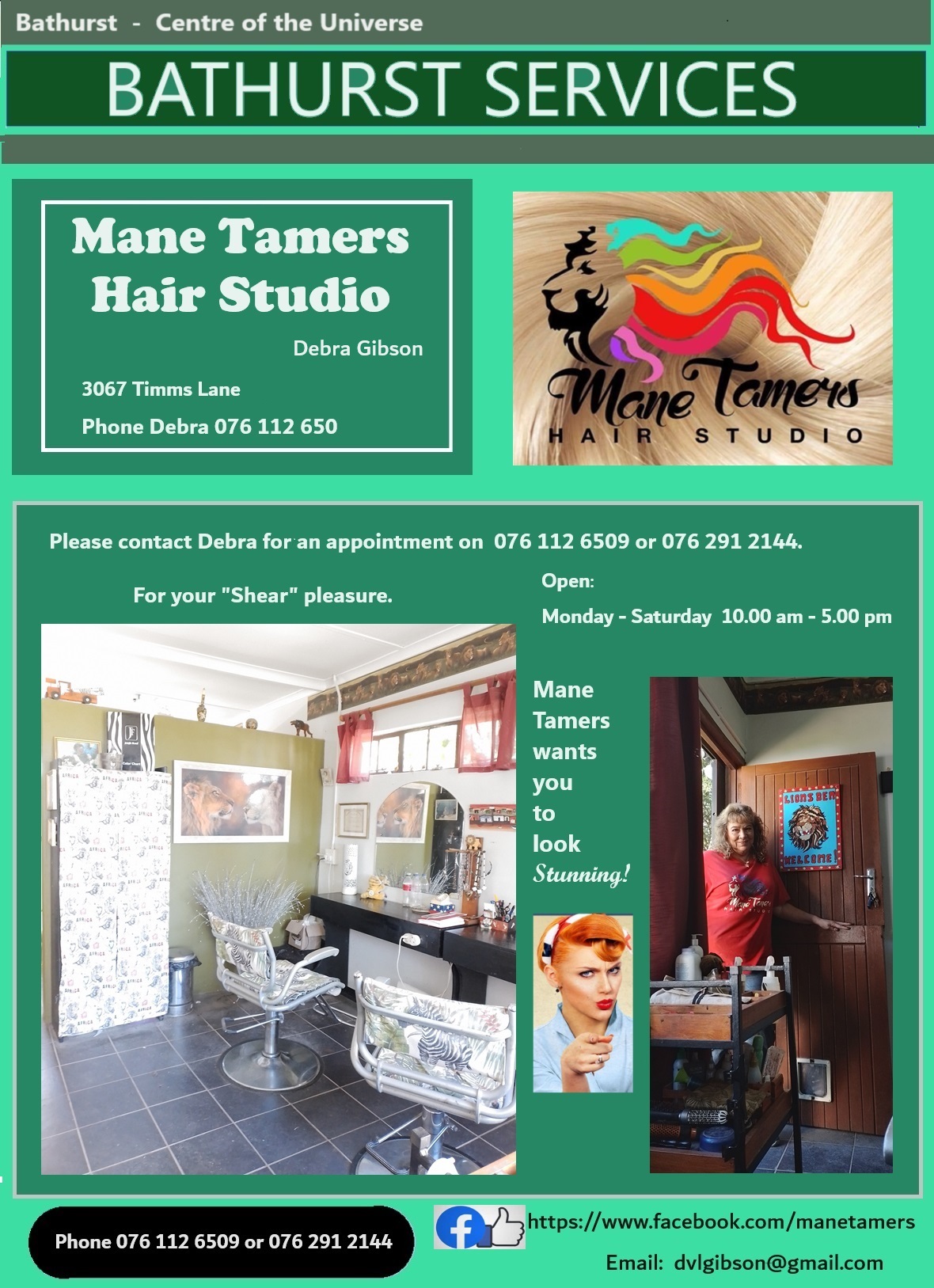 | Mane Tamers | Hairdresser | Debra Gribson | 076-112-6509 | Timns Lane / dvlgibson@gmail.com | fb | |