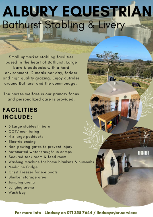| Albury Equestrian | Horse Livery | Lindsay Burrow | 071-355-7644 | Kowie Road / lindsay@ybr.services | fb | |