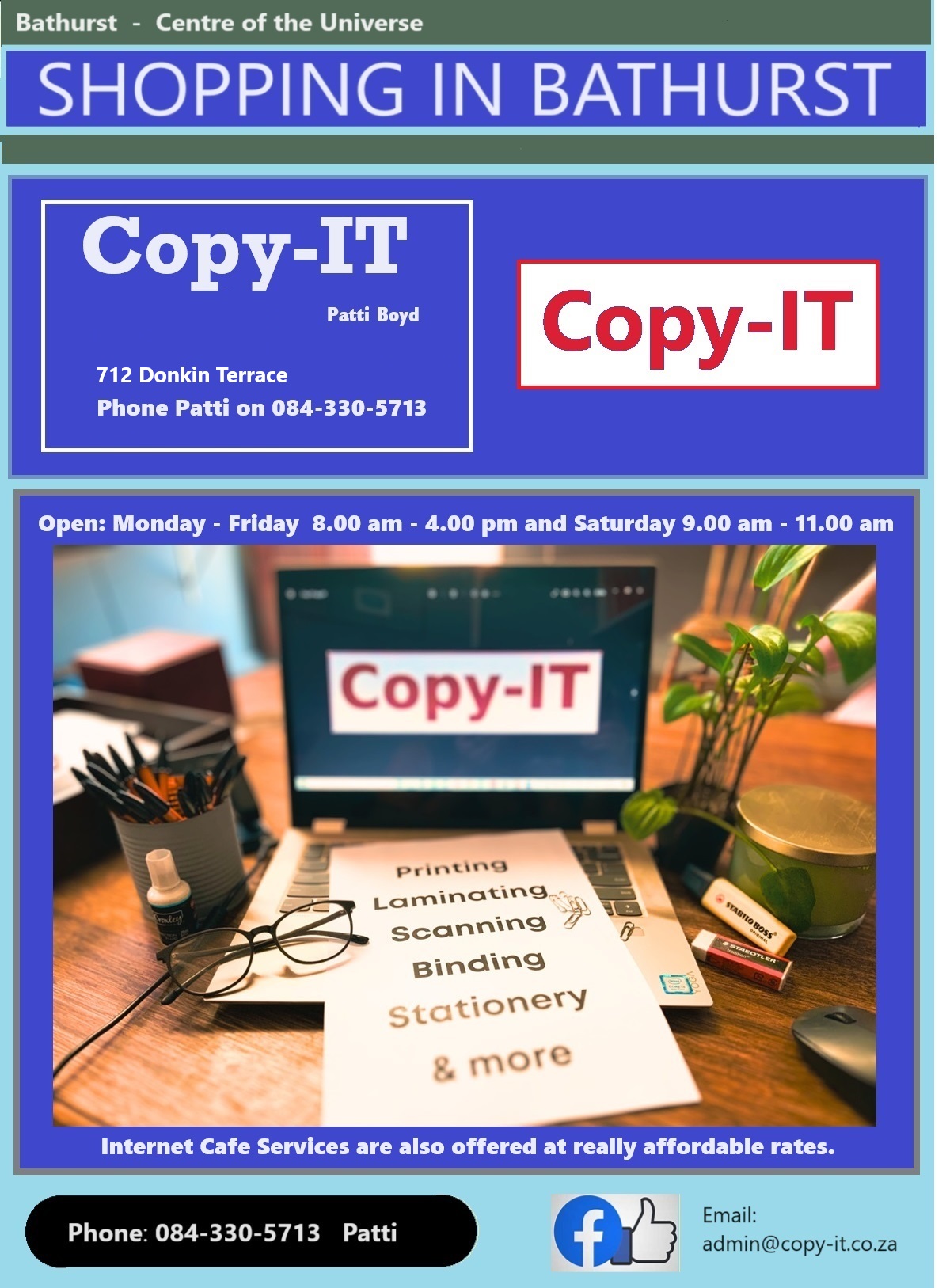 | Copy-IT | IT, copies, Stationery | Patti Boyd | 084-330-5713 | 712 Donkin Terrace / admin@copy-it.co.za | ||