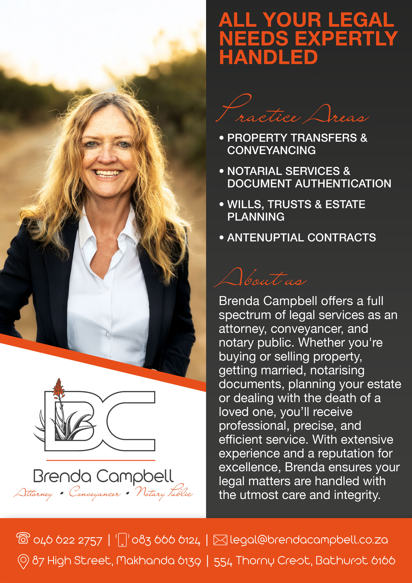 | Brenda Campbell Attorneys | Attorney / Conveyancer / Notary Public | Brenda Campbell | 083-666-6124 | legal@brendacampbell.co.za | fb | |